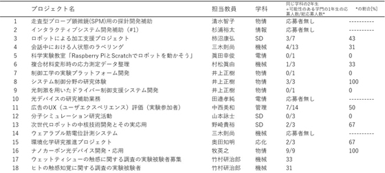 本プログラムにおける具体的なプロジェクト例を以下に示す.HPにはテーマの詳細,勤務場所,期間,報酬有無などを記載する.